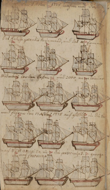 Johannes Reuber embellished his diary with several illustrations. Some depict towns and other sites in America, including what he identified as “Drin Doun” (Trenton) and “Schärlles Doun” (Charleston). However, the majority are renderings of warships, including a drawing of the fleet that went from New York to Georgia in the fall of 1778. The expedition under the command of Lieutenant Colonel Archibald Campbell included around 900 men belonging to the two Hessian regiments Trümbach (originally von Rall, then successively called von Wöllwarth, von Trümbach, and d’Angelleli) and Wissenbach (after 1780 called Knoblauch), both under the command of Lieutenant Colonel Friedrich von Porbeck. Within days of their arrival at Tybee Island, Georgia in December 1778, the corps overtook the American defenses at Savannah.