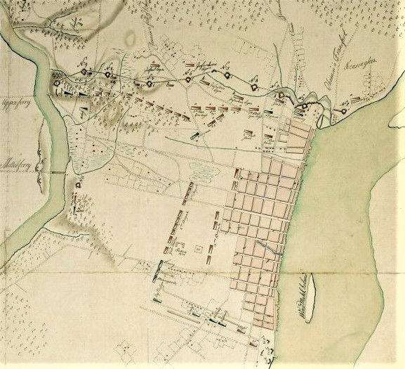 In early July 1777, more than 15,000 British and German troops along with officers, staff and servants, began to board transports at Staten Island that would take them to south. An estimated 4,450, or roughly one third of the corps, were German. (Although the records are silent about their presence, it is probable that they were accompanied by a significant number of women and children.) In late August, the army landed in Maryland from where it made its way north toward Philadelphia. On September 25, the corps reached Germantown, a village located just north of the city. The following day, a force comprised of British and Hessian soldiers marched into Philadelphia.