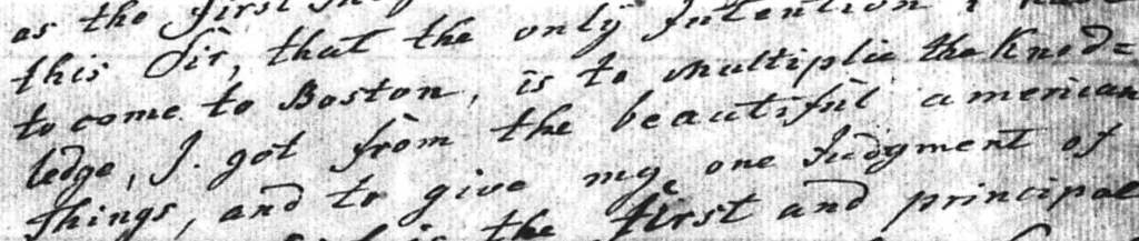 I am what is said by you, a [Suitor?] of the Justice, and employed by the Bronsvic Troops as the first Judge advocate. You’ll know by this Sir, that the only Intention i have to come to Boston, is to multiplie the knodledge, I got from the beautiful american Things, and to give my one Judgment of a Town which is the first and principal of the hole america, and i have several coussins in this Town, with i wich to seen.