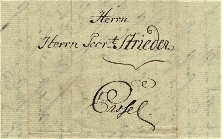 The letter is addressed to “Secrt. Strieder Cassel.” The title of the archival folder in which it is included offers more details. It is labeled “Privatbriefe aus dem amerikanischen Krieg, überwiegend an Friedrich Wilhelm Strieder [Private Letters from the American War, primarily to Friedrich Wilhelm Strieder].” Strieder (1739 – 1815) was a librarian, historian, and lexicographer based in Kassel. He is best known as the author and publisher of an 18-volume comprehensive history of Hessian scholars and writers, titled Grundlage zu einer hessischen Gelehrten und Schriftsteller Geschichte. Seit der Reformation bis auf gegenwärtige Zeiten, which he published between 1781 and 1806. But that does not explain why Hatzky may have corresponded with him.