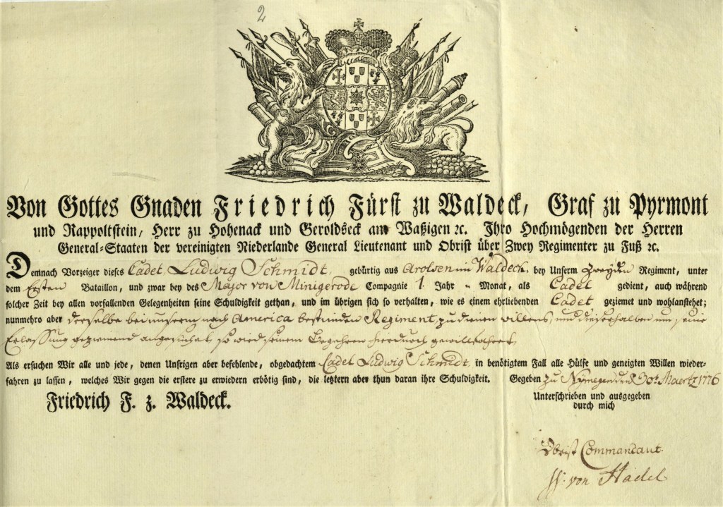 Waldeck was the smallest of the six German territories that concluded subsidy treaties with Britain during the American Revolutionary War. In April 1776, Prince Friedrich Karl August agreed to yield “to his Britannick Majesty a Corps of Infantry of six hundred and seventy men, which shall be at the entire disposition of the King of Great Britain, to be employed in his service on the same footing as the other German Troops, both in Europe and in North-America.” The treaty was signed by the prince’s representative, Friedrich Louis Wiepert von Zerbst and the British representative, William Faucitt. In all, Waldeck provided Britain with about 1,225 troops over the course of the war.