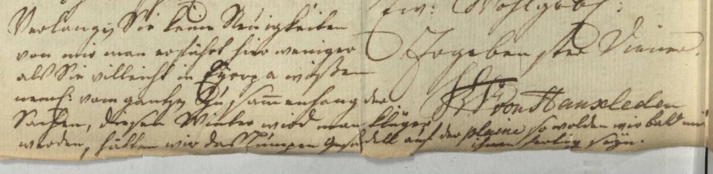 In dem Schreiben an Ihre Hochfüstl. Durchl: habe vergessen anzu fragen wie Höchst Die selben befehlen wie es mit der Verlaßenschaft dero abgehenden Leute gehalten warden soll, hier ist der Capitain der Erbe in Fall der Mann kein Frau und Kinder hinterläst, bleibt er schuldig so fäld es dem Capitain auch zur Last, dieses ist dem Major mit dem Stinmeyer schon geschen, den Er mit 9 oder 10 lb: Schuld zur Compag: bekam und Hr. Haupt: Leliwa zahlen muste. Aus dem Rapport an Ihre Hochfüstl. Durchl: werde Sie ersehen was dem Regiment gegenwärtig fehlt, solden wir mahl recruten bekommen, so schicken Sie uns nuhr keine Weiber mit, dieses ist das unnüzete Möbel von der Weld in Campagne, einige guthe Frey Corporals thun uns am nöthigsten. Alles versichert mit mir in unserm Vatterland unser vielfältiger Compliments. Leben Sie wohl, ich befehle ohnaufhörl: Erw: Wohlgeb: Ergebenster Diener J L W von Hanxleden