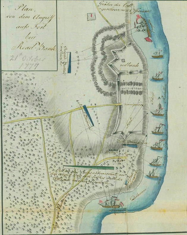 Plan of the Attack on the Fort at Red Bank, 21 October 1777, accessed at “The Captain Johann von Ewald Diaries: Maps of the Revolutionary War,” Map p. 101.