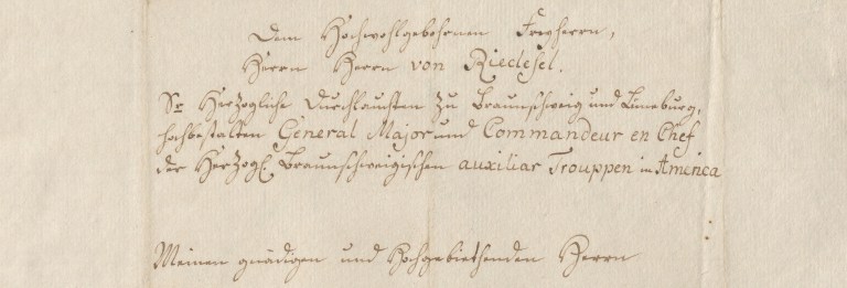 Citation: The two letters are included in “Schriftwechsel des Generalmajors Friedrich Adolf, Freiherrn von Riedesel…”, WO 237 N Nr. 61, ff. 83-84, Lower Saxony State Archives Wolfenbüttel.