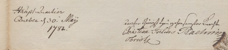 […] I had mentioned in my most recent reports to his Grace, dated October 14 and November 15, that I have been stationed with the regiment of His Serene Highness Prinz Friedrich in the garrison at Quebec this past winter. […] Before leaving the encampment, I had all the uniforms [“Mondirungen”] of the companies repaired so well that it received the approval of Major General von Riedesel, who arrived here from captivity before I moved into the garrison. However, despite all the repairs, the uniforms were too old and worn out to last through the entire winter, which is very long here, had it not been for a convenient opportunity that provided me with the means to address this concern.