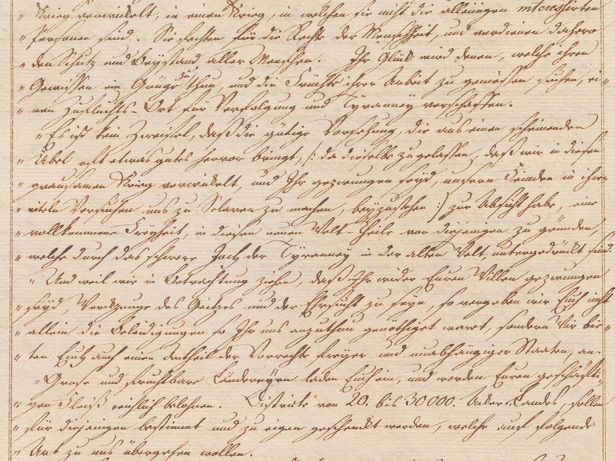 In Nahmen dieser eigenmächtigen, freyen und unabhängigen Staaten versprechen und versichern Wir Euch des grosen Vorzugs der Menschen, einer freyen und ununterbrechenen Ausübung der Religion, vollkommenen Schutz Eurer Personen für Beleidigungen, des ungestörten Besitzes der Früchte Eurer ehrlichen Arbeit, eines absoluten Eigenthums, der Euch geschenkten Ländereyen, das sich auf Eure Kinder und Kindes Kinder erstrecken soll, ausgenommen, Ihr soltet sie auf eine andere Art anwenden wollen. Auf Befehl des Congresses