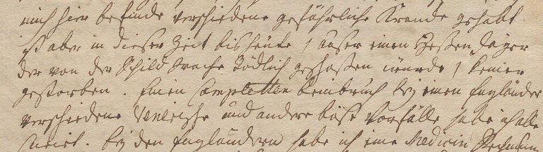 Erw. Hochwohlgebohren habe unterthänig melden wollen daß die Gefangenen in den Barraks allhier sich anjetzt in guten gesundheits Umständen befinden. Ich habe auch die Engländer und Heßen unter meiner Vorsorge, wenn selbige an Medicin etwas benötiget sind, ich habe in den 16 Monathen daß ich mich hier befinde verschiedene gefährliche Kranke gehabt ist aber in dieser Zeit bis heute (auser einen Heßen Jäger der von der Schildwache tödlich geschoßen wurde) keiner gestorben. Einen Completten Beinbruch bey einen Engländer verschiedene Venerische und ander böse Vorfälle habe ich aber curirt. Bey den Engländern habe ich eine Medicin Rechnung von 16 lb, die ich vorgeschoßen, zu fordern und wünsche daß ich selbige bezahlt bekommen könte, weil ich dadurch in Schulden gerathen bin und meine Gage kaum hinreicht mich hier zuerhalten, ich habe bey den Engländern viel Mühe und Last gehabt und nichts als den Werth der Medicin in meiner Rechnung angesetzt, aber ich hoffe das ich dereinst [Wörter unleserlich] ausgewechselt werden, von mein [Wörter unleserlich] es im vorigen Krieg in Teutschland [Wörter unleserlich] üblich war.